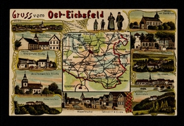 Worbis, Kirchworbis Pfarrei u. Kirche, Breitenworbis Kirche, Scharfenstein, Eichsfelder Trachten, Kirche von Bernterode, Hüpstedt Kirche mit Pfarrei, Reifenstein, Gernrode, Schloss Bodenstein, Niederorschel Jähndorf mit Kirche, Landkarte, Deuna Rittergut und Kirche |
