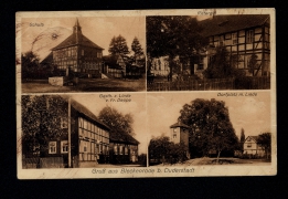 Schule, Rittergut, Gasth. z. Linde v. Fr. Deppe, Dorfplatz m. Linde |