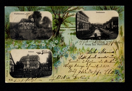 Spiegelbrücke mit Westerthurm, Ursulinen-Kloster, Bahnhofstr. m. evang. Kirche, Rathhaus, Panorama, Kath. Probstei-Kirche mit Schule |