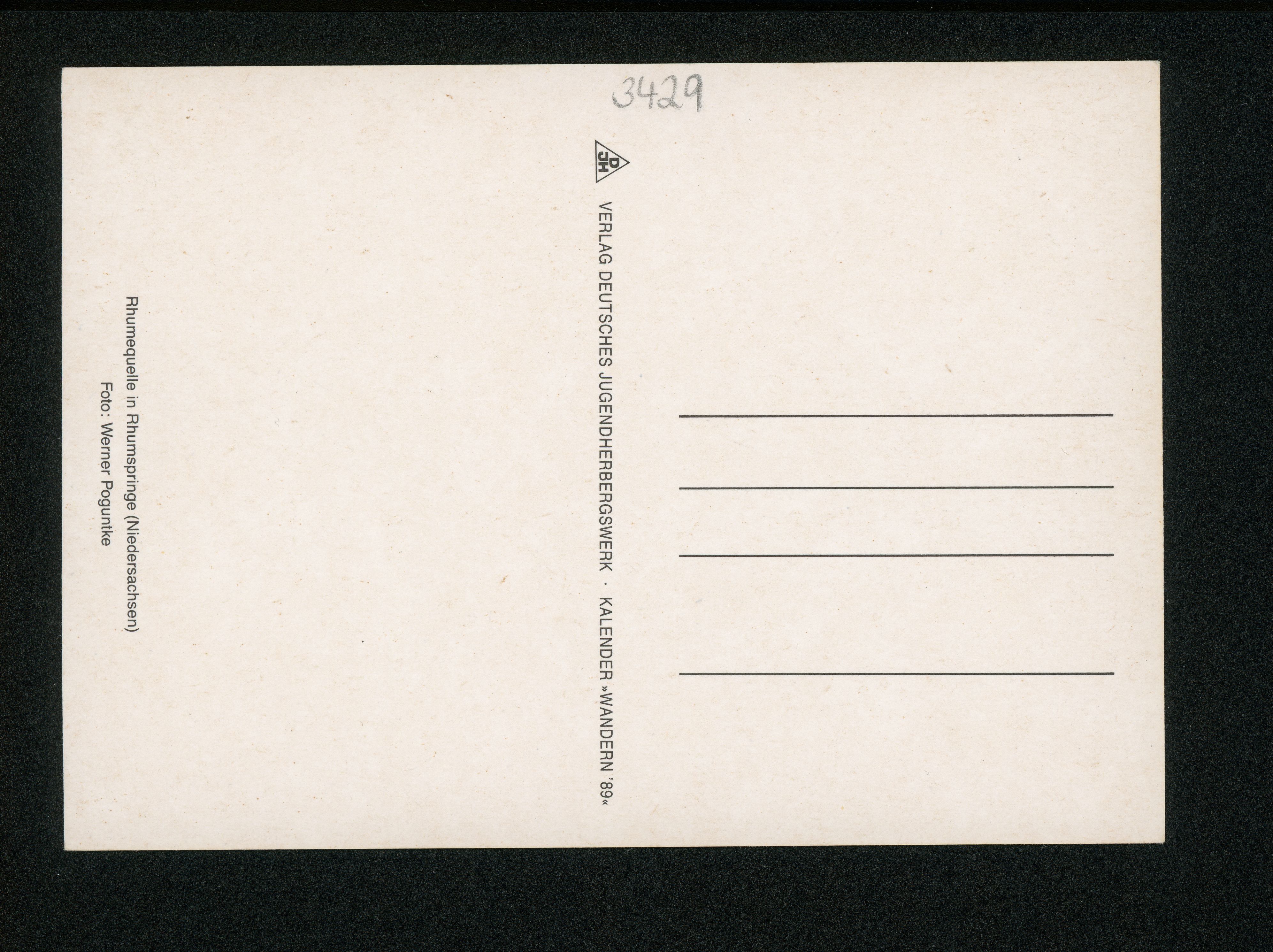 Ort Rhumspringe Motive Rhumequelle in Rhumspringe ''Niedersachsen'' Format groß Jahr 1989 Verlag Deutsches Jugendherbergswerk, Hannover Bestell- oder Individualnummer Nr. 906 Tags Kalender >>Wandern '89<<