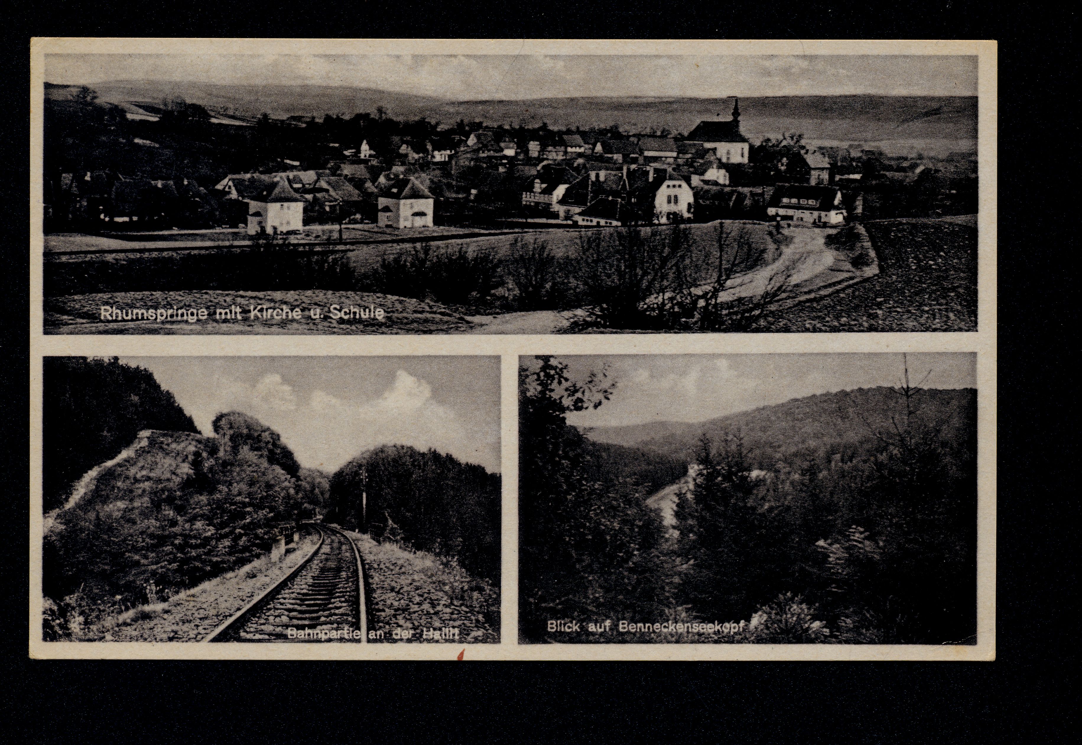 Ort Rhumspringe Motive Rhumspringe mit Kirche u. Schule Bahnpartie an der Hallit Blick auf den Benneckenseekopf Format klein Verlag Aloys Mecke, Duderstadt Bestell- oder Individualnummer Nr. 952 h 28