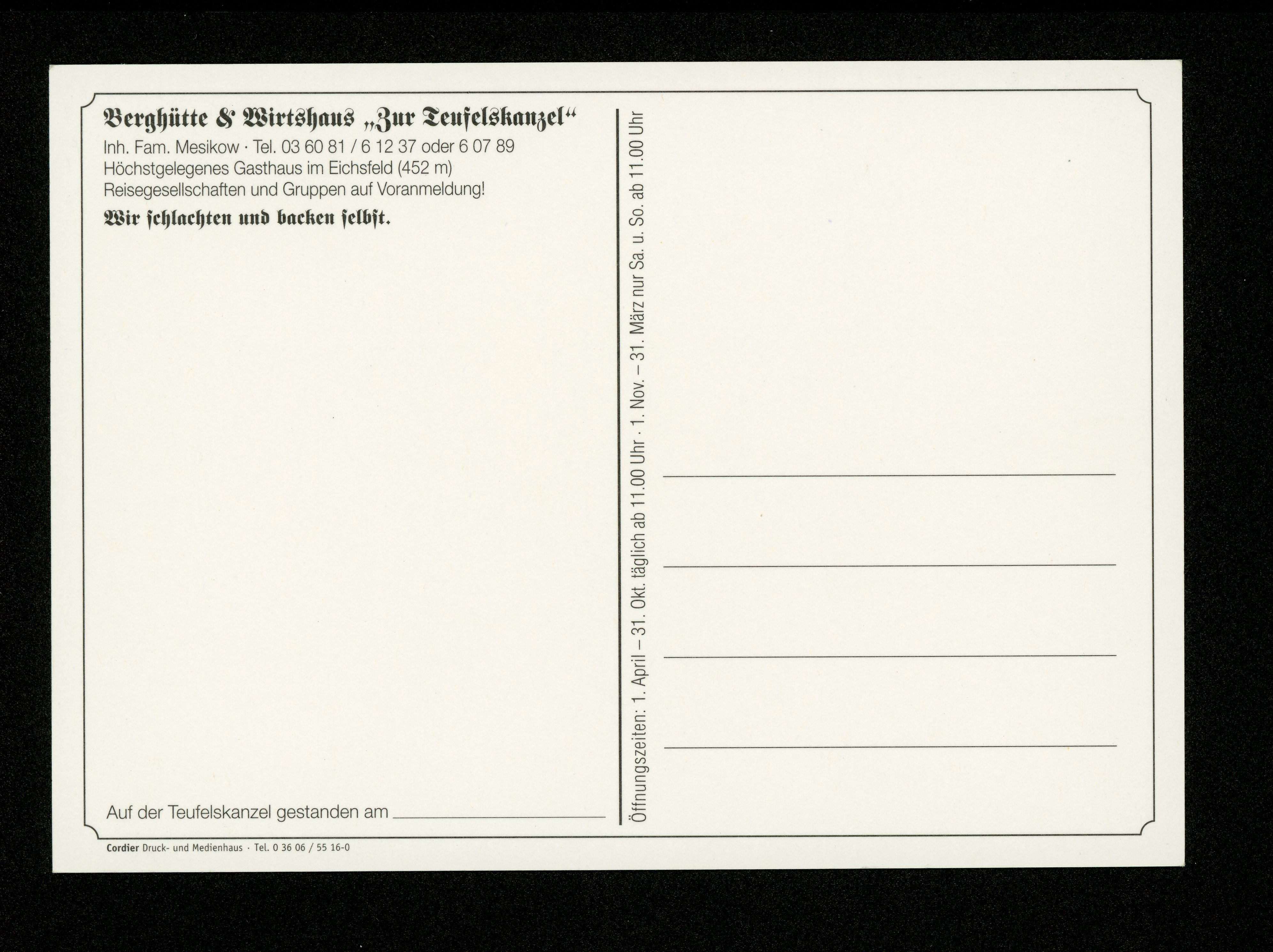 Ort Rothenbach Motive Berghütte & Wirtshaus ''Zur Teufelskanzel'' Inh. Fam. Mesikow Format groß Verlag F. W. Cordier, Heiligenstadt Bestell- oder Individualnummer - Tags Gasthaus