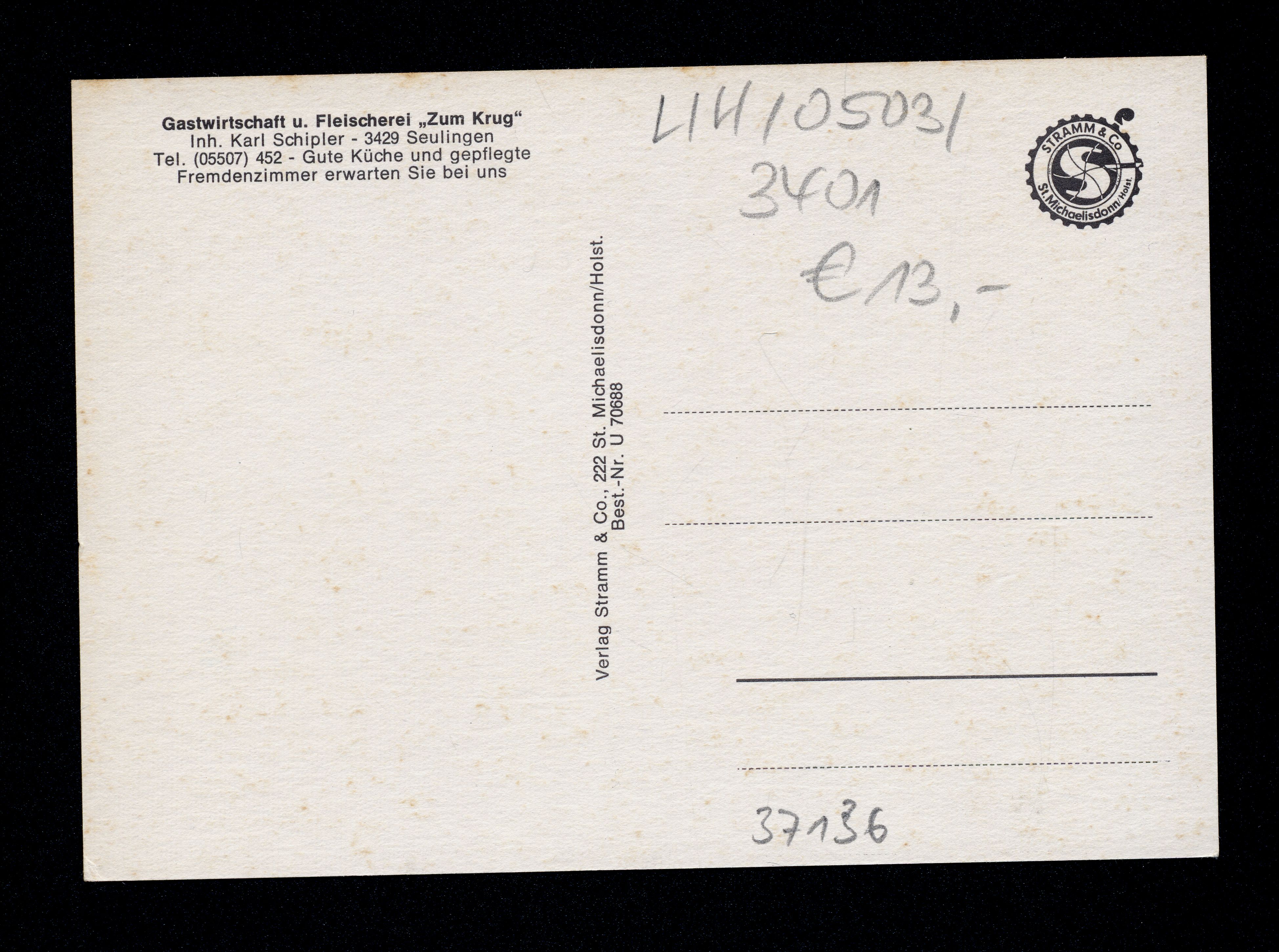 Ort Seulingen Motive Gastwirtschaft u. Fleischerei ''Zum Krug'' Inh. Karl Schipler Format groß Verlag Stramm, St. Michaelisdonn / Holst. Bestell- oder Individualnummer Best.-Nr. U 70688 Tags Gasthaus