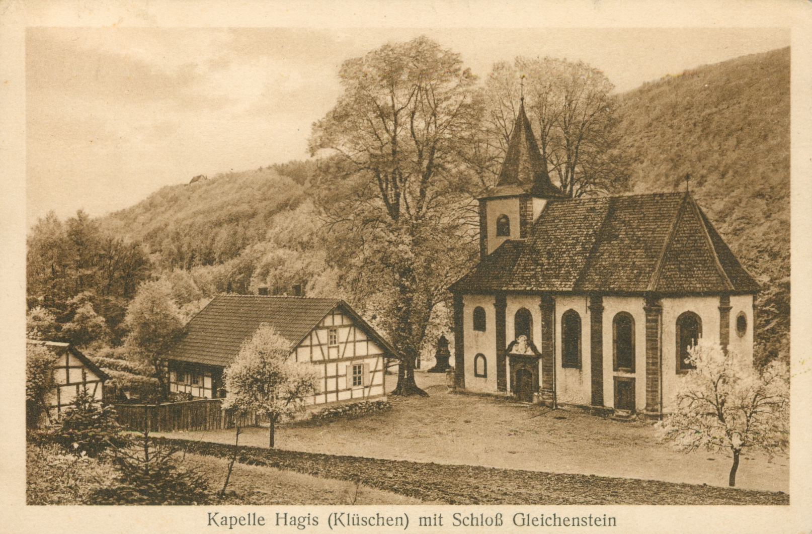 Ort Wachstedt Motive Kapelle Hagis (Klüschen) mit Schloß Gleichenstein Format klein Verlag Aloys Mecke, Duderstadt Bestell- oder Individualnummer Nr. 368/II d 71 Tags Burg Gleichenstein