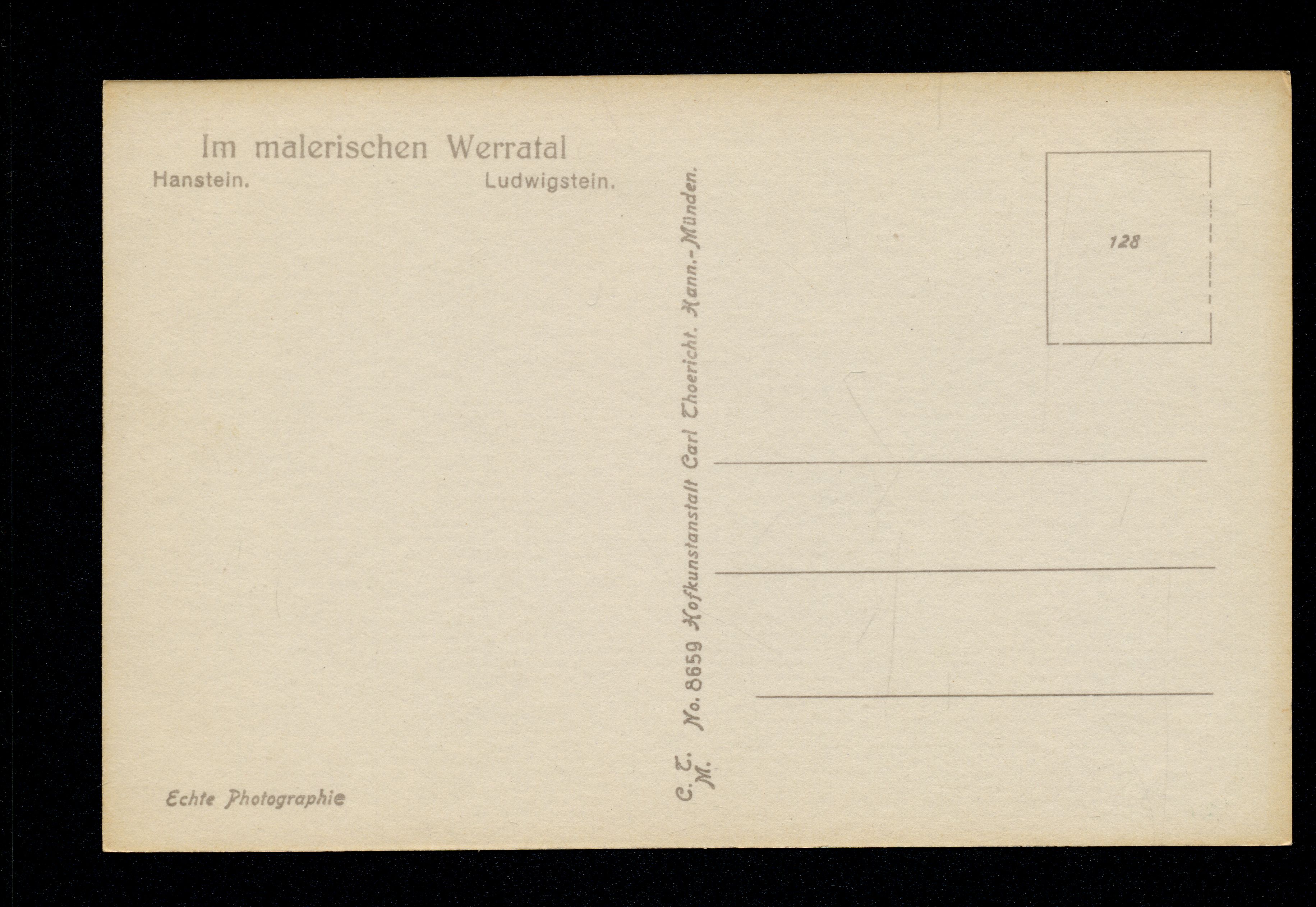 Ort Werleshausen Motive Hanstein Ludwigstein Format klein Verlag Carl Thoericht, Hann.-Münden (Karl Thoericht) (CTM) Bestell- oder Individualnummer No. 8659 128 Tags Burg Hanstein Burg Ludwigstein Bornhagen Zweiburgenblick