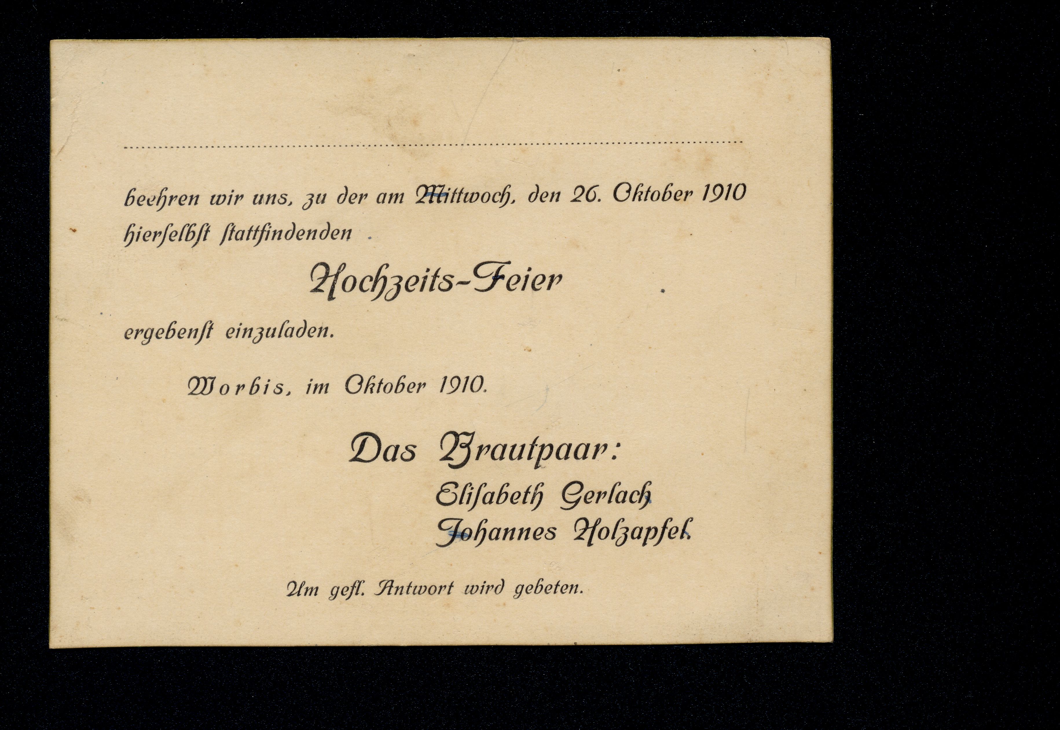Ort Worbis - Belege Beschreibung Beleg aus Papier Motive Einladung zur Hochzeits-Feier von Elisabeth Gerlach + Johannes Holzapfel Format Sonderformat Jahr 1910 Verlag - Bestell- oder Individualnummer -